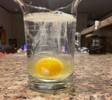 I bought some eggs. I said, “Holy Spirit, I dedicate these eggs to you”. I put them in the fridge. I prayed about the egg cleanse for a few hours. When I was ready, I got an eggs out of the carton. I filled a glass measuring cup with water, and I added a small amount of salt to the water. I put the egg to my forehead and said, “Holy Spirit, please use the oil in this egg to cleanse me from the top of my head to the tips of my toes”. I sat and prayed for a while. Then I cracked the egg into the salt water. This was the result: