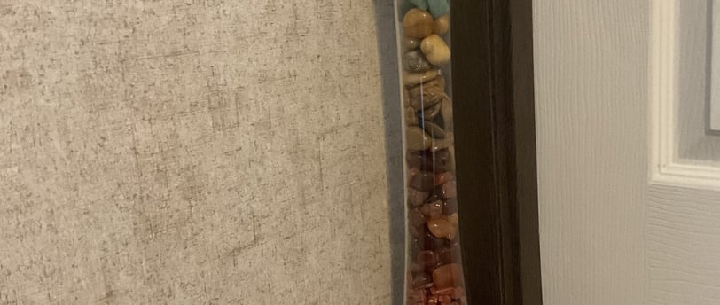 I purchased a tall, clear vase and filled it with crystals. This vase is in a corner area next to my closet door in my master bedroom. The crystals in this vase are: red jasper, carnelian, a colorful jasper mix, green aventurine, white quartz, lapis lazuli, and amethyst. I purchased this vase and all of these crystals from Hobby Lobby.