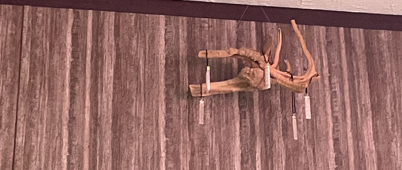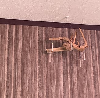 I made this with a piece of driftwood. It has selenite wands hanging from it. I hung it up with fishing line. It’s hanging in my living room.