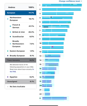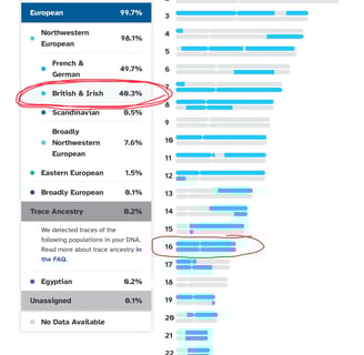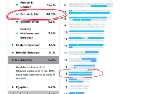 I did “23 and Me”. From looking at my gene map, I found that I have 2 copies of the gene for red hair. The genes that control red hair are found on chromosome #16. The gene for red hair is recessive, so you must have 2 copies of the gene for red hair to be displayed. The picture below shows that 100% of both of my chromosome #16s are “British and Irish”. Because the gene for red hair is Irish, I have determined that I have these genes.